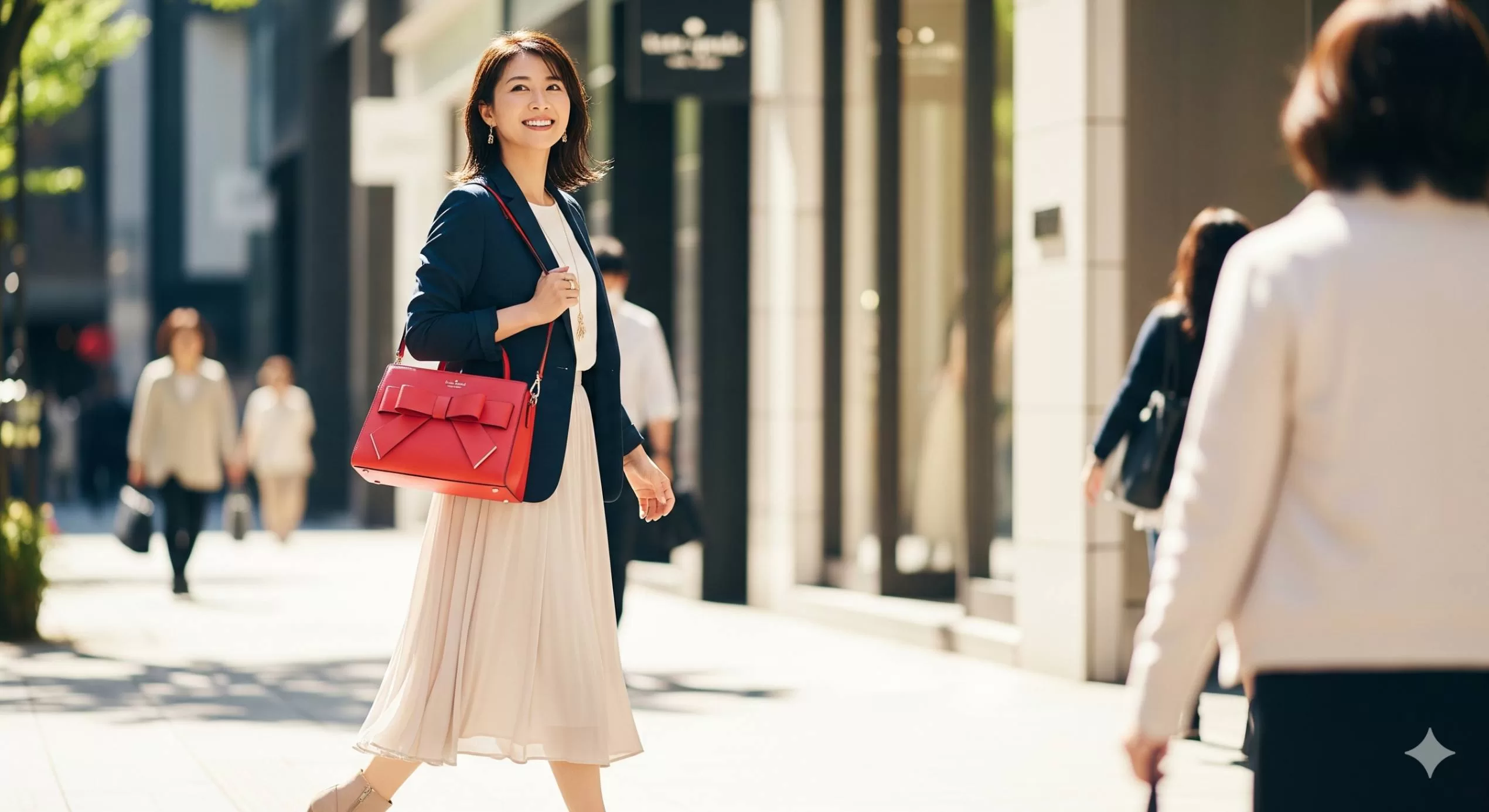 彼女たちの着こなしは、ケイトスペードが持つ「華やかさ」と「上品さ」をうまく両立させています。