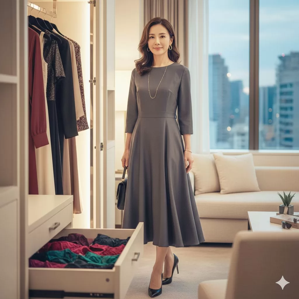 - 「デコルテ(首元)」を見せる: 首や胸元(デコルテ)をきれいに見せるデザインは、人の目線が自然と上に集まるので、全体がスッキリして見えます。